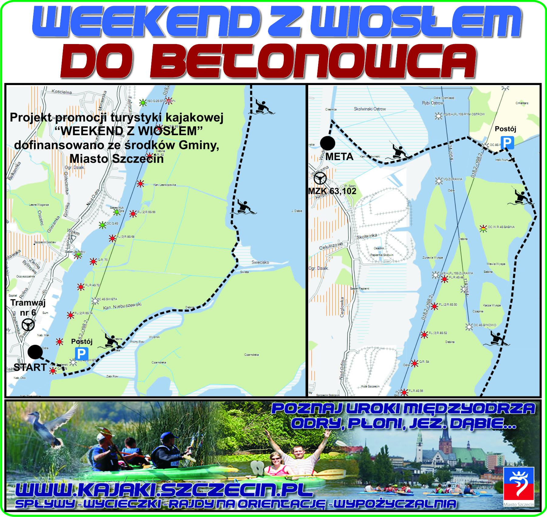 Na miejsce startu dotrzemy tramwajami linii 6. Na rozjeździe ulicy Wiszesława i Strzałowskiej szukamy Grobli i idziemu ku Odrze. Trasa spływu: Golęcin Grobla - kanał Żeglarski - zatoka U-bootów - Święta - Dąbski Przesmyk - jezioro Dąbie - kanał Leśniczówka - Las Kormoranów - Wyspa Kacza - Wyspa Mewia - Betonowiec - Inoujście - Odra - Skolwin ulica Wodna. Z powodu warunków pogodowych na jeziorze Dąbie, przebieg trasy może ulec zmianie. Startujemy z Golęcina na drugi brzeg Odry. Wpływamy w kanał Żeglarski i następnie na kanał Święta, jeden z bardziej malowniczych szlaków wodnych Szczecina. Na chwilę zatrzymamy się na jednym z bocznych kanałów, gdzie bazowały U-booty, wychodzące ze stoczni. Płynąc dalej dotrzemy do jeziora Dąbie. Tutaj będziemy płynęli zachodnim brzegiem jeziora mijając po drodze Las Kormoranów - siedlisko i "dom" tych żarłocznych ptaków. Po minięciu wysp; Kacza i Mewia, kierujemy się na doskonale widoczny kadłub Betonowca. Powstał w okresie II Wojny Światowej w odpowiedzi na brali stali i jej oszczędności. Ma długość 90 metrów i zbudowano go w 1941 roku. Statek ochrzczono nazwą "Ulrich Finsterwalder" i jego żywot był krótki. Pod koniec wojny zatopiono go na torze wodnym - w późniejszym okresie przeholowano na mieliznę. I tak powstała nieznana atrakcja turystyczna jeziora Dąbie. Nieopodal betonowca zatrzymujemy się na plażyczce aby odpocząć i jeśli się uda skorzystać z rozpalenia ogniska. Po odpoczynku płyniemyw kierunku Odry, przecinamy ją i ruszamy kanałem ku mecie wycieczki kajakowej Wikinga. Kończymy na przystani na kanale Cieśnica. Z tąd po chwili można udać się na przystanek autobusów 63 i 102 i powrócić do domu, lub na miejsce startu.