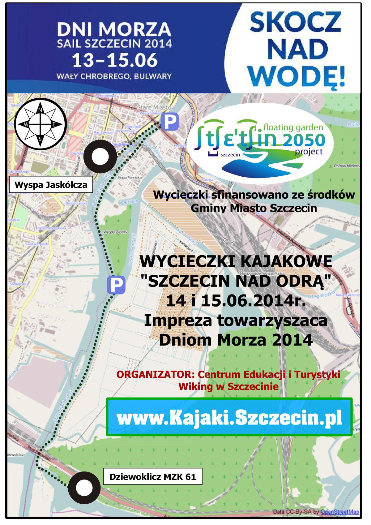Wycieczka startuje w obok parkingu przy kąpielsku Dziewoklicz. Prowadzić będzie po Odrze i Szczecińskiej Wenecji. Kanał Leśny - Odra - wyspa Krainka (Akademicka - postój) most Długi - Wypa Jaskółcza. Trasa promuje walory wodne miasta Szczecin. Przebiega prawie po centrum miasta. Tutaj możemy podziwiać nasze miasto z wody. Po drodze jeśli się uda zobaczymy czaple a nawet bobra. Start wycieczki obok parkingu kąpieliska Dziewoklicz. Wyruszamy początkowo Kanałem Leśnym (Odyńca). Po dopłynięciu do Odry skręcamy w prawo i płyniemy wzdłuż Wyspy Puckiej. Dopływamy do Wyspy Krainki, gdzie mamy krótki odpoczynek. Do ciekawostek - na wyspie znajdował się ośrodek wioślarski (ruiny) a przed wojną szkolono tutaj saperów. Po postoju, płyniemy dalej. Po lewej mijamy nowootwartą oczyszczalnię ścieków, dzięki której wody rzeki Odry są coraz czystsze. Dopływamy do Wyspy Zielonej. Płyniemy Odrą w kierunku naszej "Szczecińskiej Wenecji". Trzymamy się prawego brzegu płynąc w dół rzeki, a przed nami powoli wyłania się zza drzew Szczecin. Mijamy wieżę ruinę gazowni oraz stocznię rzeczną z zabytkowym slipem dla wodowanych i remontowanych tutaj barek.
